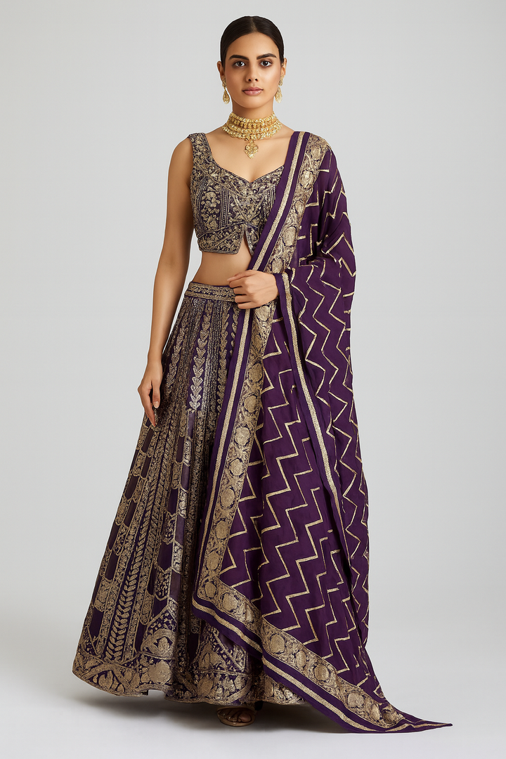 Turn heads this festive season with this purple designer blouse paired with a Banarasi silk lehenga, crafted to perfection for modern yet traditional elegance. The rich Banarasi silk fabric radiates a royal sheen, while intricate katdana, mirror, and sequence work add a luxurious touch to the outfit.