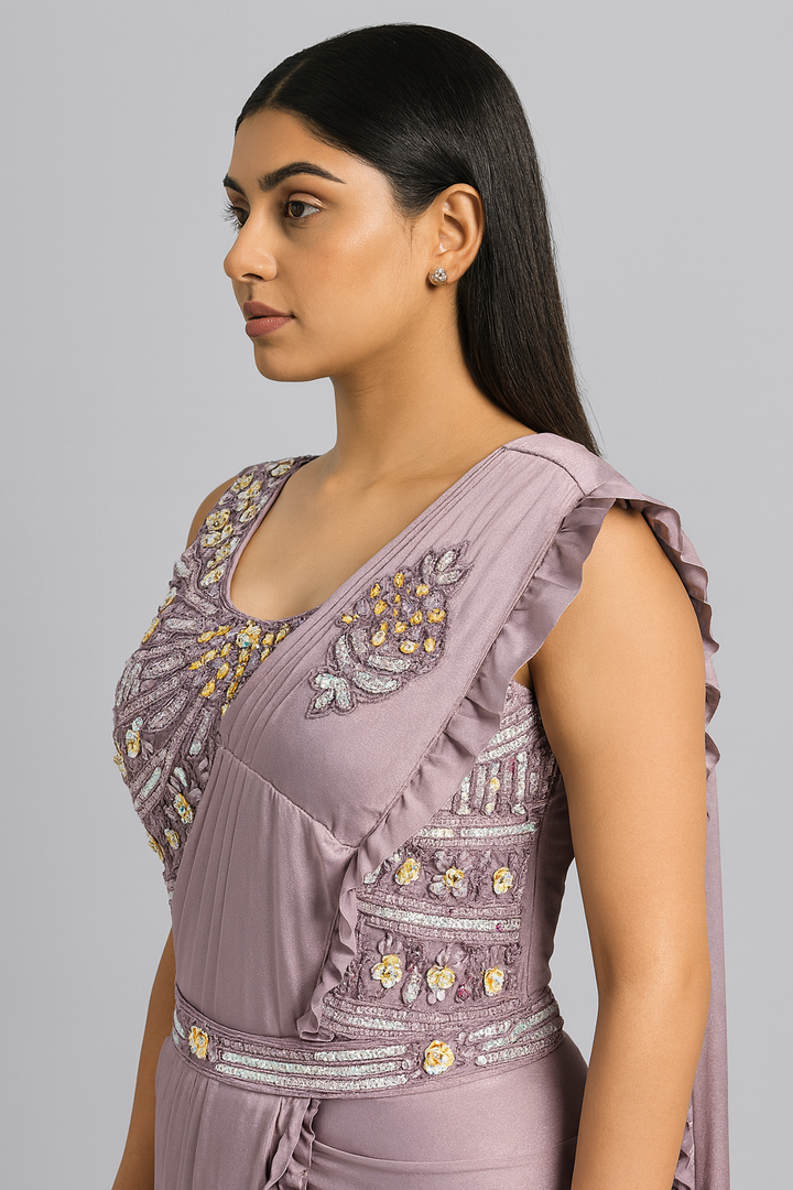 Grace your festive occasions with our Frill Border Elegant Drape Saree – a ready-to-wear saree crafted for parties, cocktails, and weddings. Made from premium lycra fabric, this saree features a sleeveless round-neck blouse for a sleek, modern look.