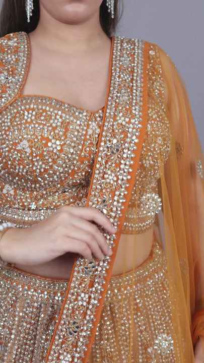Step into grandeur with our Lehenga Choli Indo-Western Style – a designer ensemble crafted for weddings, receptions, and festive celebrations. Made from premium net fabric, this lehenga features a choli-cut neckline blouse with cut sleeves, paired with a voluminous lehenga for a regal yet modern silhouette.